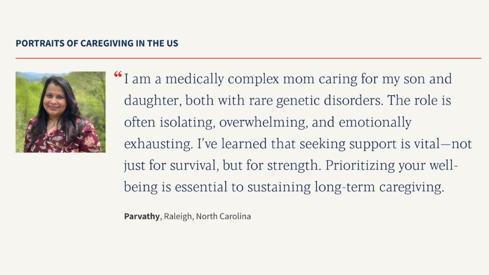Take Parvathy, a mother caring for a child with a rare disease. Her story illustrates what the data makes clear: caregiving can touch anyone, anywhere, at any stage of life. And every caregiving journey is unique, shaped by the medical needs of the person receiving care, the resources available, and the systems (or lack of systems) in place to help.